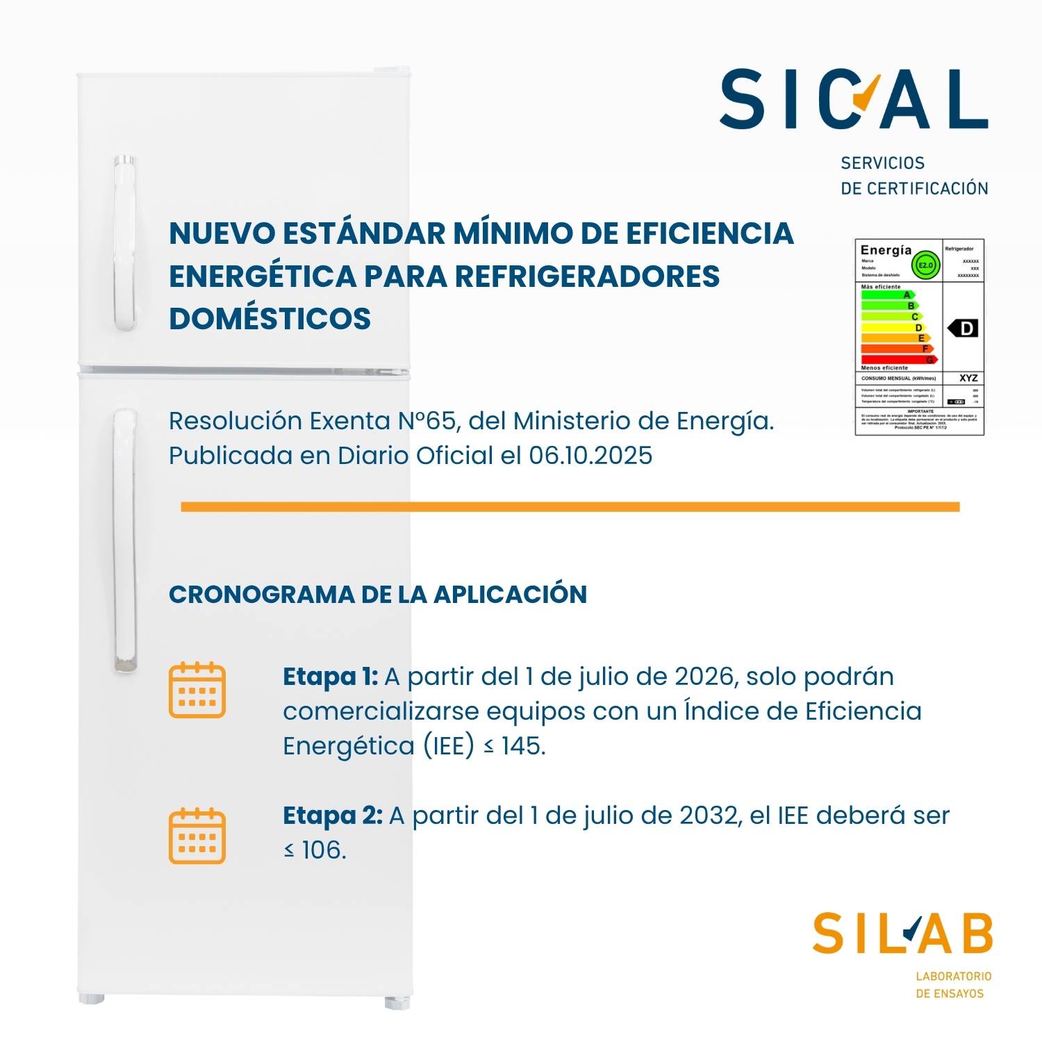 Con fecha 06.10.25 fue publicada en el Diario Oficial la 𝗥𝗲𝘀𝗼𝗹𝘂𝗰𝗶𝗼́𝗻 𝗘𝘅𝗲𝗻𝘁𝗮 𝗡°𝟲𝟱 del 𝗠𝗶𝗻𝗶𝘀𝘁𝗲𝗿𝗶𝗼 𝗱𝗲 𝗘𝗻𝗲𝗿𝗴𝗶́𝗮 𝗱𝗲 𝗖𝗵𝗶𝗹𝗲 , que fija un nuevo estándar mínimo de eficiencia energética para refrigeradores domésticos, congeladores y refrigerador-congelador.